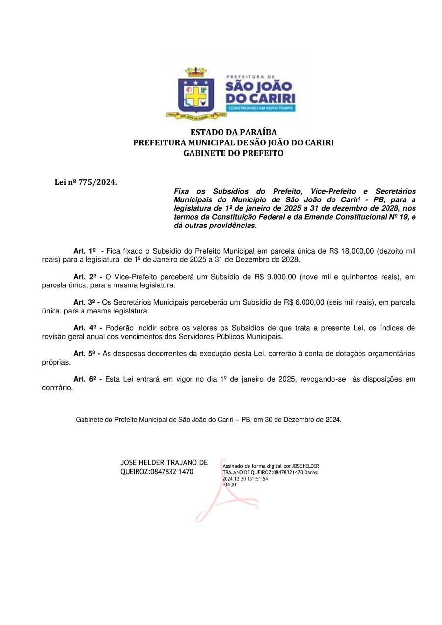LEI Nº 775/2024 - FIXA OS SUBSÍDIOS DO PREFEITO, VICE-PREFEITO E SECRETÁRIOS MUNICIPAIS DO MUNICÍPIO DE SÃO JOÃO DO CARIRI - PB, PARA A LEGISLATURA DE 1º DE JANEIRO DE 2025 A 31 DE DEZEMBRO DE 2028