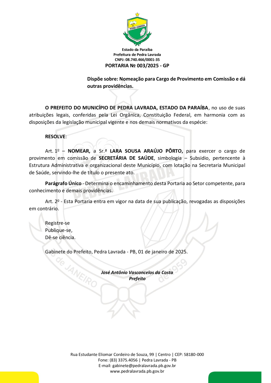 PORTARIA N° 0003/2025 - DISPÕE SOBRE NOMEAÇÃO PARA CARGO DE PROVIMENTO EM COMISSÃO