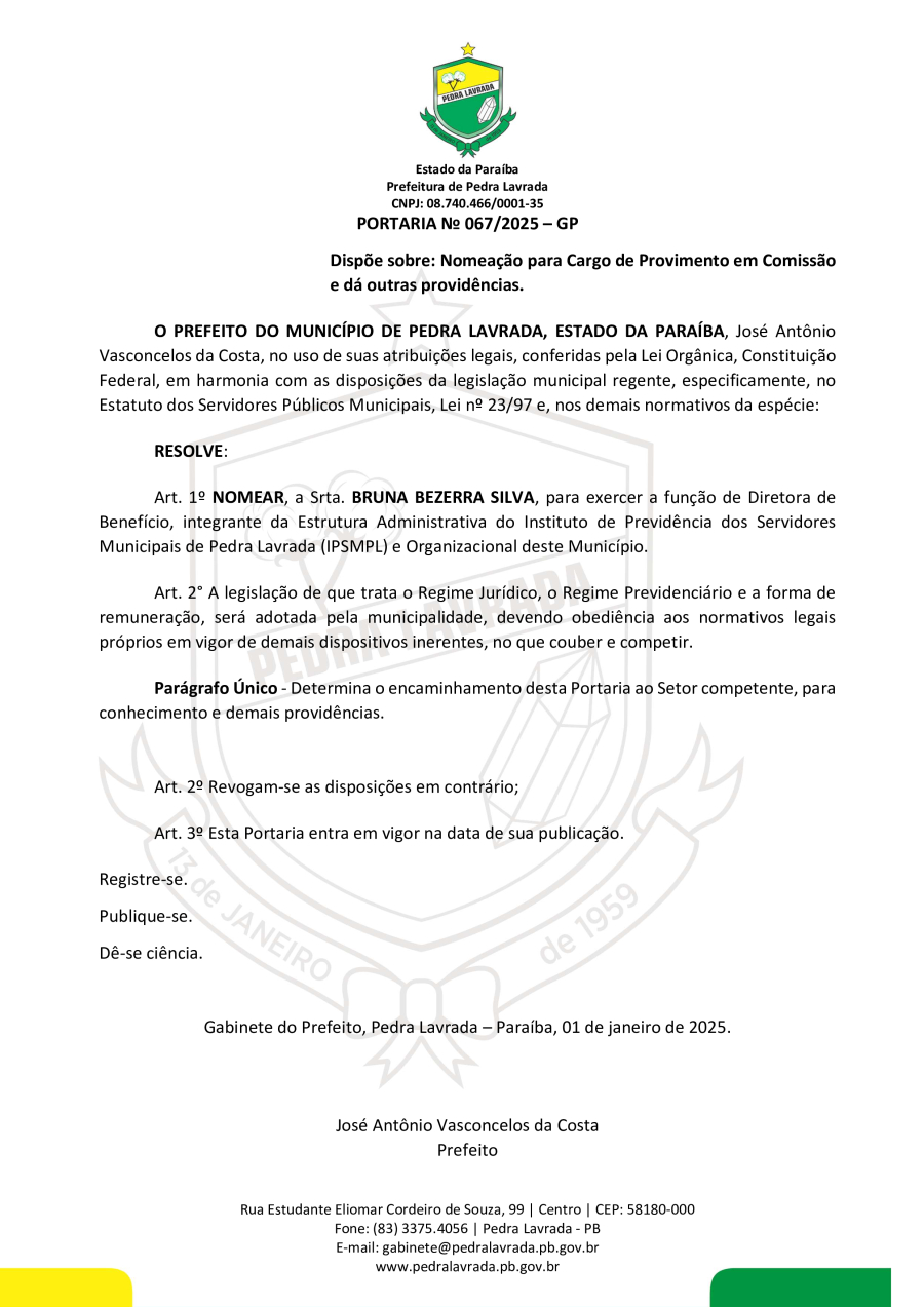PORTARIA N° 0067/2025 - DISPÕE SOBRE NOMEAÇÃO PARA CARGO DE PROVIMENTO