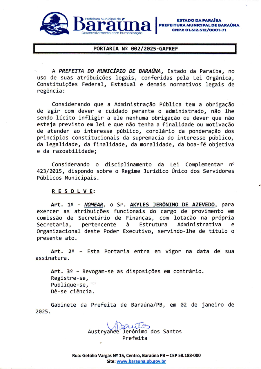 PORTARIA Nº 002/2025-GAPREF - NOMEAR O SR. AKYLES JERÔNIMO DE AZEVEDO, PARA EXERCER AS ATRIBUIÇÕES FUNCIONAIS DO CARGO DE PROVIMENTO EM COMISSÃO DE SECRETÁRIO DE FINANÇAS. - 02 DE JANEIRO DE 2025.