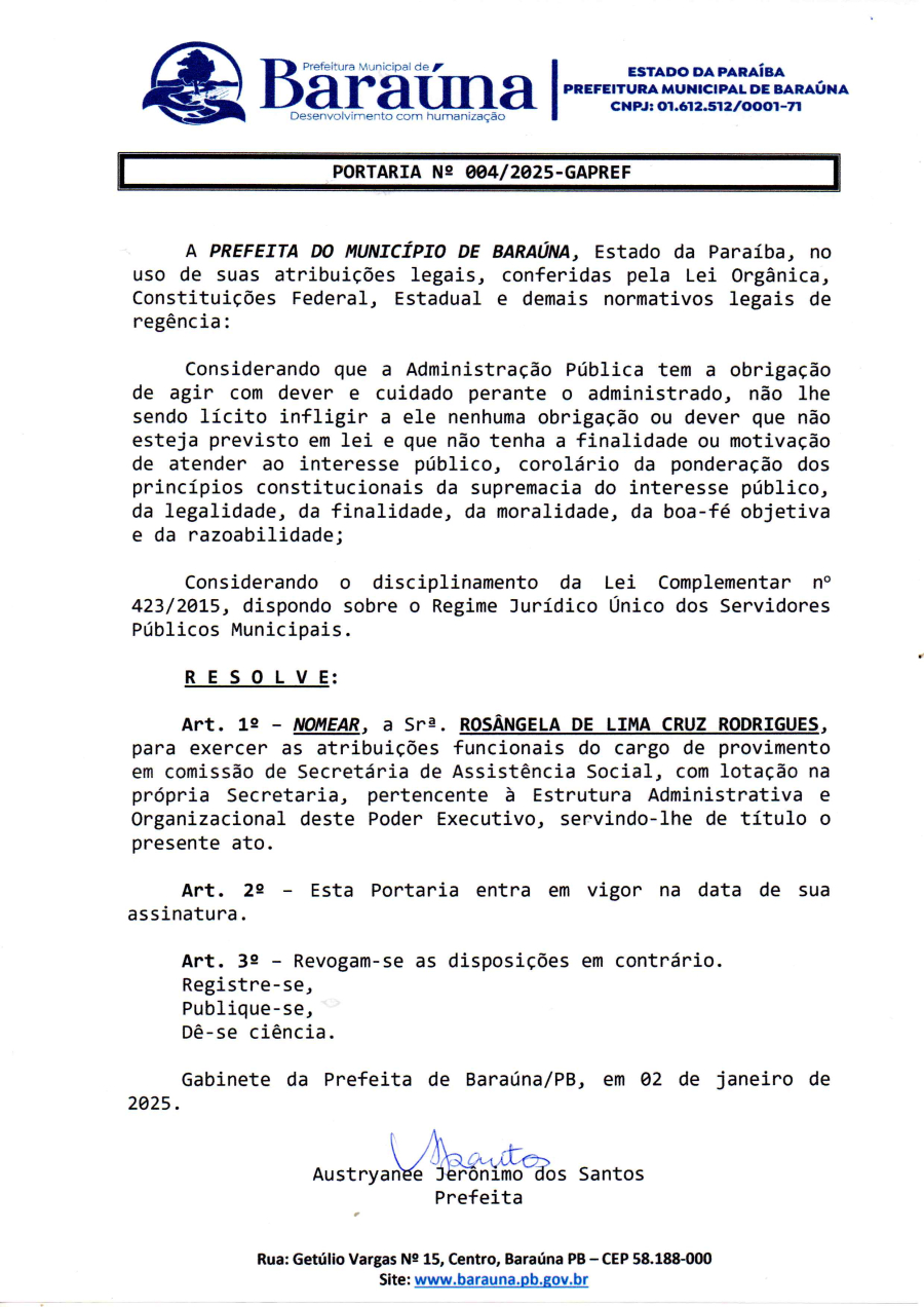 PORTARIA N° 004/2025-GAPREF - NOMEAR , A SRº ROSANGELA DE LIMA CRUZ RODRIGUES. - 02 DE JANEIRO DE 2025.