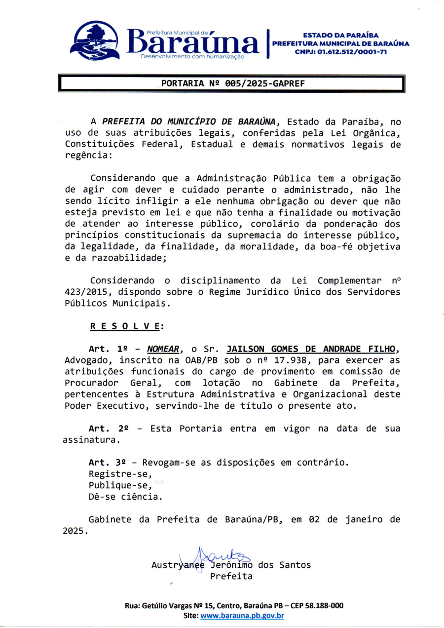 PORTARIA Nº 005/2025-GAPREF - NOMEAR O SR. JAILSON GOMES DE ANDRADE FILHO, ADVOGADO INSCRITO NA OAB/PB SOB O Nº 17.938, PARA EXERCER AS ATRIBUIÇÕES FUNCIONAIS DO CARGO DE PROVIMENTO EM COMISSÃO DE PROCURADOR GERAL. - 02 DE JANEIRO DE 2025.
