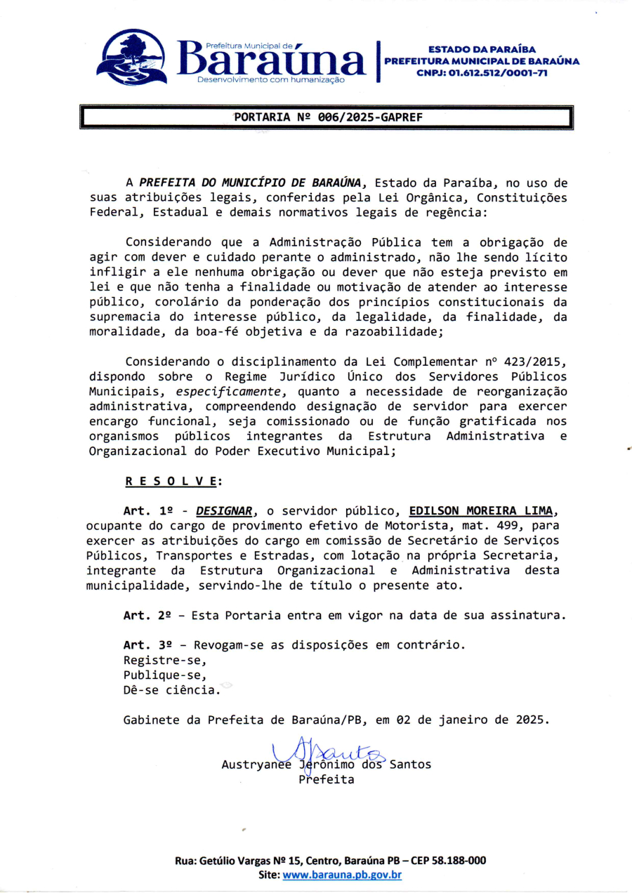 PORTARIA Nº 006/2025-GAPREF - DESIGNAR O SERVIDOR PÚBLICO EDILSON MOREIRA LIMA, OSUPANTE DO CARGO EM PROVIMENTO EFETIVO DE MOLTORISTA, MAT. 499, PARA EXERCER AS ATRIBUIÇÕES DO CARGO EM COMISSÃO DE SECRETÁRIO DE SERVIÇOS PÚBLICOS, TRANSPORTES E ESTRADAS. - 02 DE JANEIRO DE 2025.