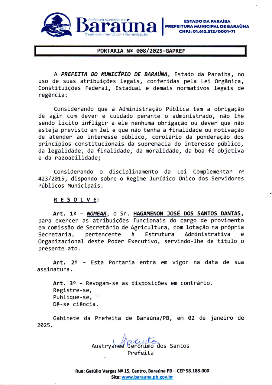 PORTARIA Nº 008/2025-GAPREF - NOMEAR O SR. HAGAMENON JOSE DOS SANTOS DANTAS, PARA EXERCER AS ATRIBUIÇÕES FUNCIONAIS DO CARGO DE PROVIMENTO EM COMISSÃO DE SECRETÁRIO DE AGRICULTURA. - 02 DE JANEIRO DE 2025.