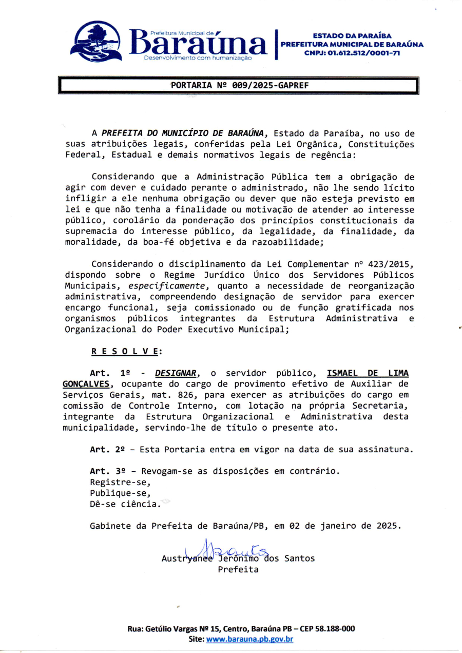 PORTARIA Nº 009/2025-GAPREF - DESIGNAR O SERVIDOR PÚBLICO ISMAEL DE LIMA GONÇALVES, OCUPANTE DO CARGO DE PROVIMENTO EFETIVO DE AUXILIAR DE SERVIÇOS GERAIS, MAT. 826, PARA EXERCER AS ATRIBUIÇÕES DO CARGO EM COMISSÃO DE SECRETÁRIO DE CONTROLE INTERNO. - 02 DE JANEIRO DE 2025.
