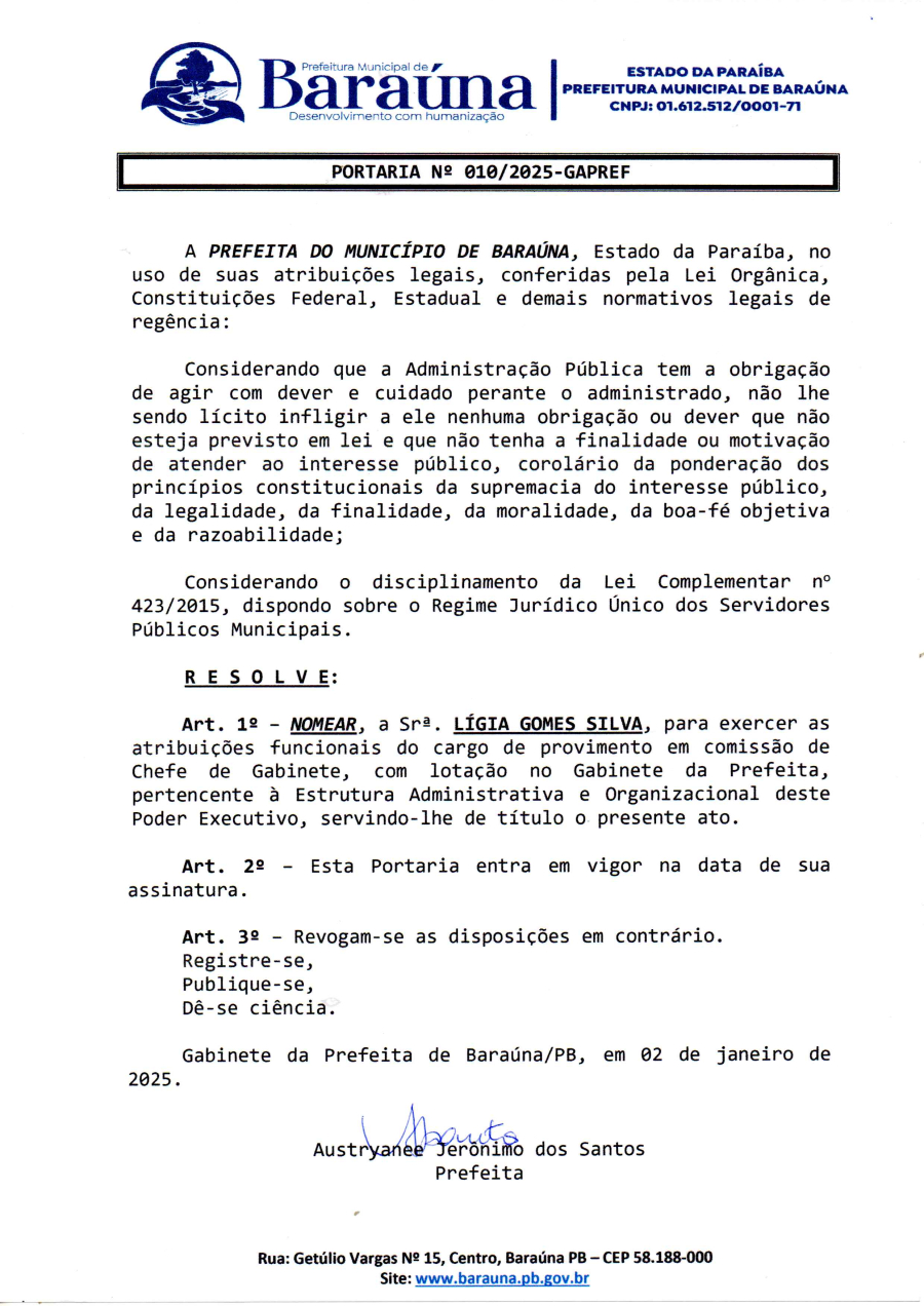 PORTARIA Nº 010/2025-GAPREF - NOMEAR A SRª LÍGIA GOMES SILVA, PARA EXERCER AS ATRIBUIÇÕES FUNCIONAIS DO CARGO DE PROVIMENTO EM COMISSÃO DE SECRETÁRIA DE CHEFE DE GABINETE. - 02 DE JANEIRO DE 2025.