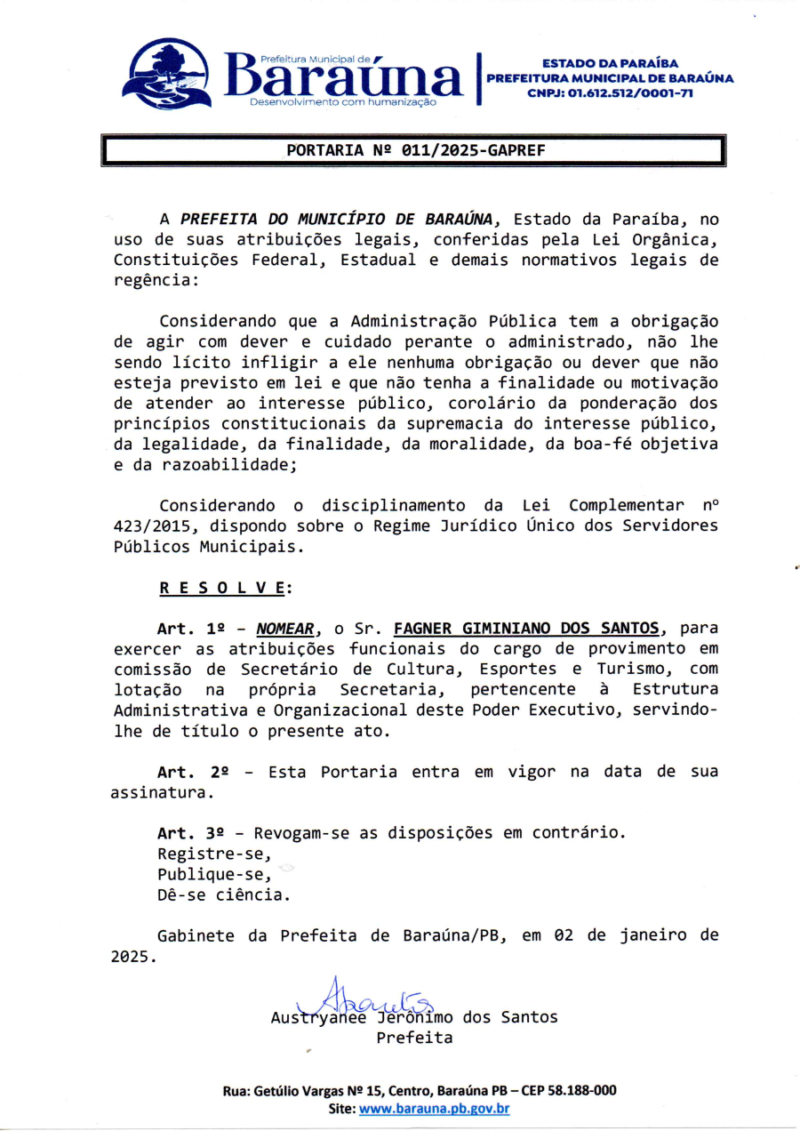 PORTARIA Nº 011/2025-GAPREF - NOMEAR O SR. FAGNER GIMINIANO DOS SANTOS, PARA EXERCER AS ATRIBUIÇÕES FUNCIONAIS DO CARGO DE PROVIMENTO EM COMISSÃO DE SECRETÁRIO DE CULTURA, ESPORTES E TURISMO. - 02 DE JANEIRO DE 2025.