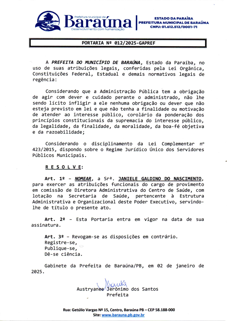 PORTARIA Nº 012/2025-GAPREF - NOMEAR A SRª JANIELE GALDINO DO NASCIMENTO, PARA EXERCER AS ATRIBUIÇÕES FUNCIONAIS DO CARGO DE PROVIMENTO EM COMISSÃO DE DIRETORA ADMINISTRATIVA DO CENTRO DE SAÚDE. - 02 DE JANEIRO DE 2025.