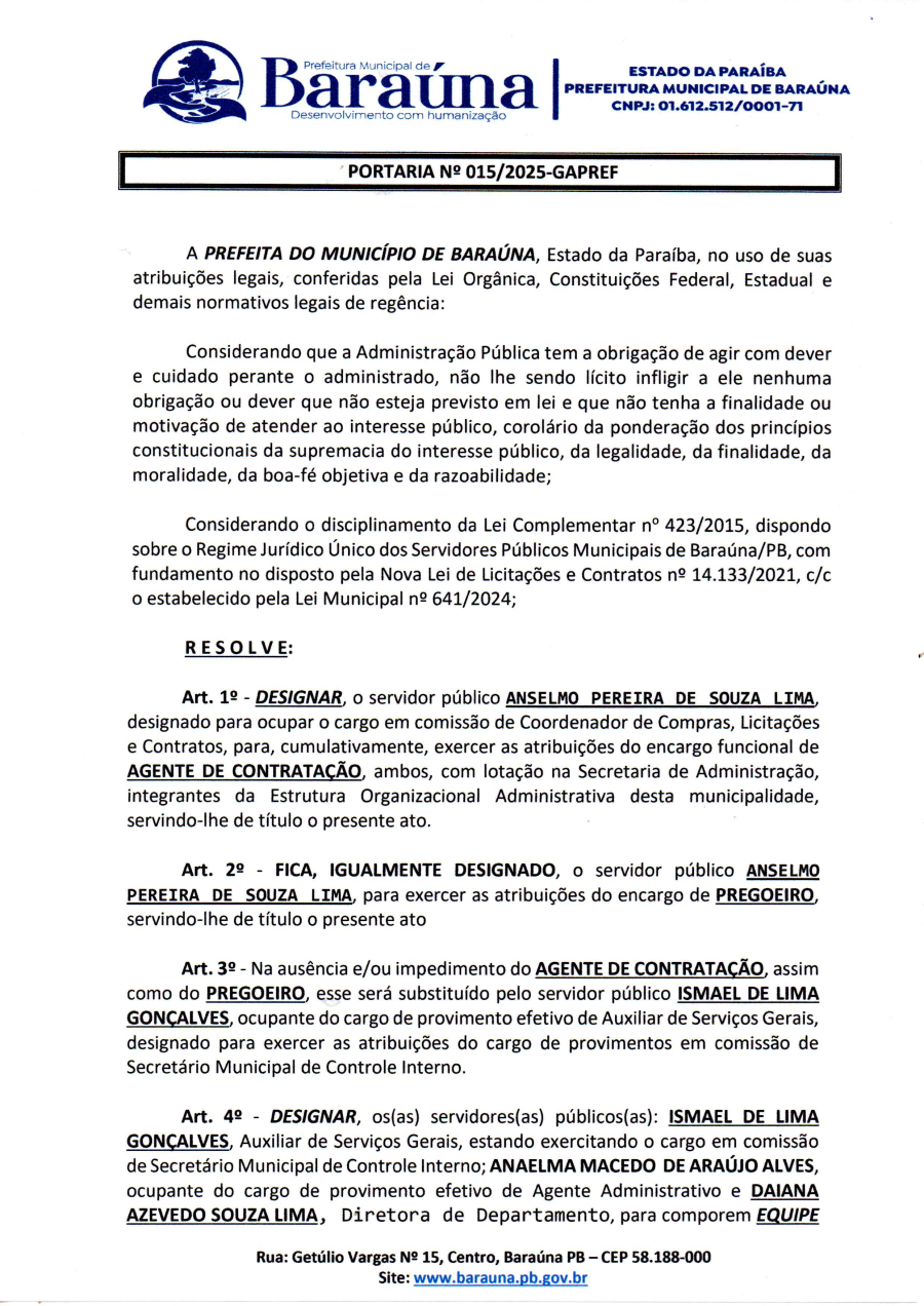 PORTARIA Nº 015/2025-GAPREF - DESIGNAR O SERVIDOR PÚBLICO ANSELMO PEREIRA DE SOUZA LIMA, DESIGNADO PARA OCUPAR O CARGO EM COMISSÃO DE COORDENADOR DE COMPRAS, LICITAÇÕES E CONTRATOS, PARA , CUMULATIVAMENTE, EXERCER AS ATRIBUIÇÕES DO ENCARGO FUNCIONAL DE AGENTE DE CONTRATAÇÃO. - 02 DE JANEIRO DE 2025.