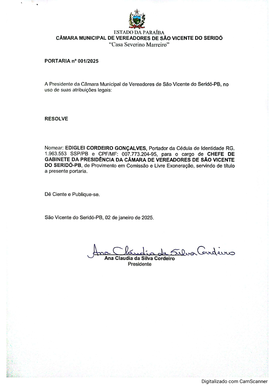 PORTARIA N° 0001/2025 - NOMEAÇÃO DE EDIGLEI CORDEIRO GONÇALVES