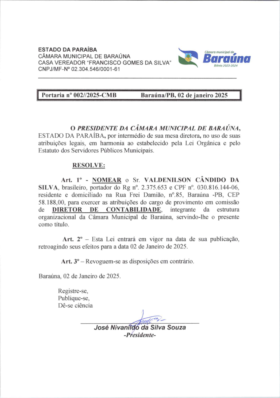 PORTARIA Nº 002/2025-CMB - NOMEAR O SR. VALDENILSON CÂNDIDO DA SILVA, PARA EXERCER SUAS ATRIBUIÇÕES DO CARGO DE PROVIMENTO EM COMISSÃO DE DIRETOR DE CONTABILIDADE. - 07 DE JANEIRO DE 2025.