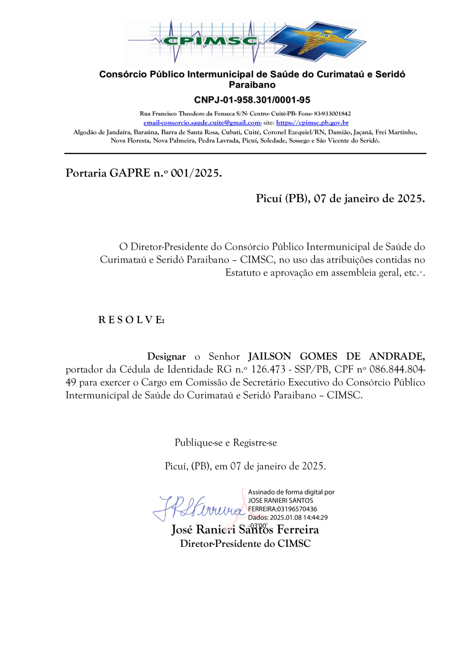 Conforme MP n° 2.200-2 de 24/08/2001, que institui a infraestrutura de chaves Públicas. Matéria Publicada no Diário Oficial do Consórcio Intermunicipal de Saúde do Curimataú e Seridó Paraibano/PB no dia - Edição 01138.