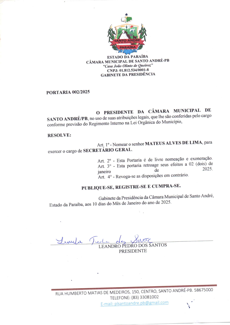 PORTARIA Nº 0002/2025 - NOMEAÇÃO DO SENHOR MATEUS ALVES DE LIMA, PARA EXERCER O CARGO DE SECRETÁRIO GERAL
