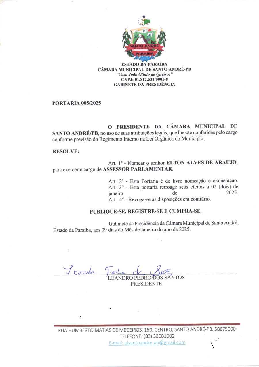 PORTARIA N° 0005/2025 - NOMEAÇÃO DO SENHOR ELTON ALVES DE ARAUJO, PARA EXERCER O CARGO DE ASSESSOR PARLAMENTAR