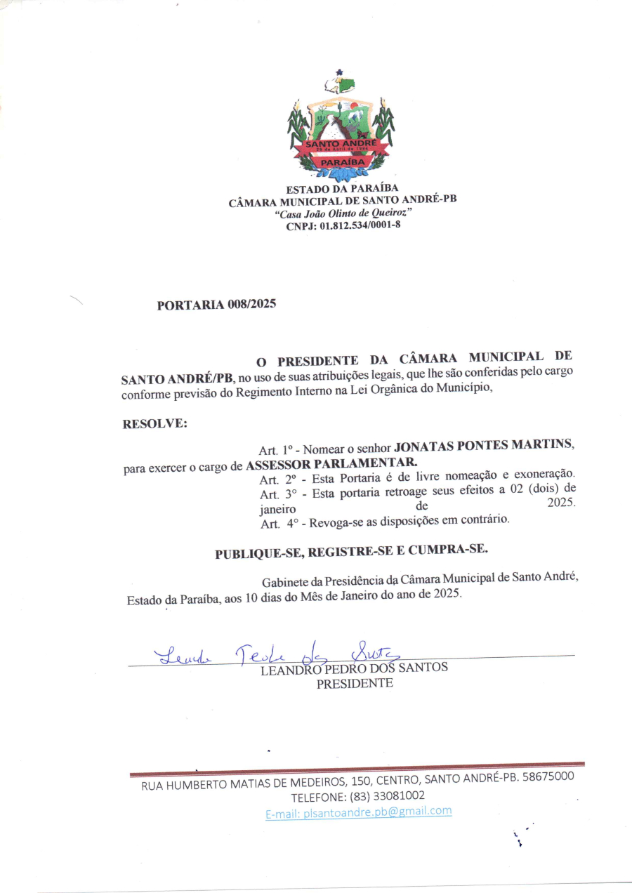 PORTARIA Nº 0008/2025 - NOMEAÇÃO DO SENHOR JONATAS PONTES MARTINS, PARA EXERCER O CARGO DE ASSESSOR PARLAMENTAR