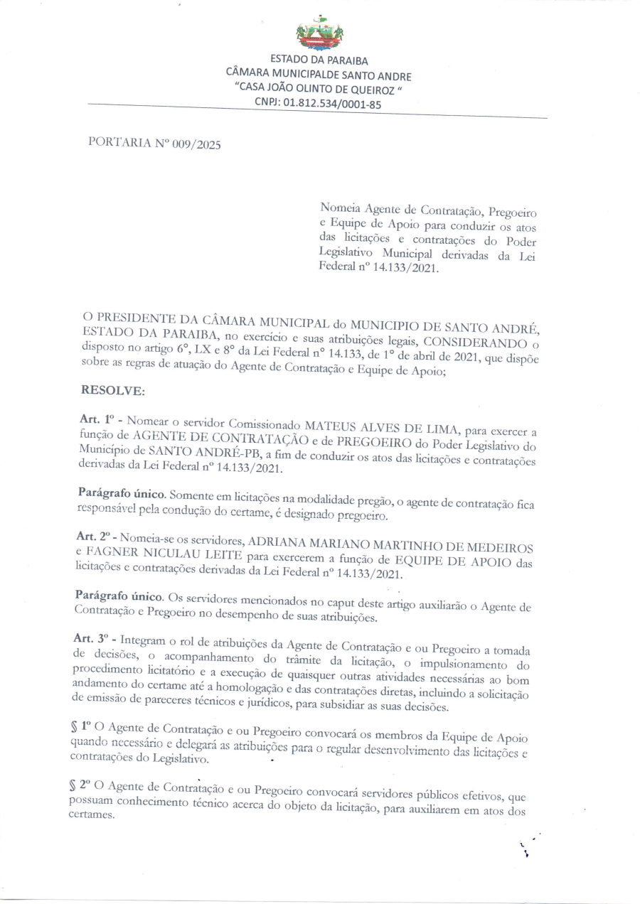 PORTARIA Nº 0009/2025 - NOMEIA AGENTE DE CONTRATAÇÃO, PREGOEIRO E EQUIPE DE APOIO PARA CONDUZIR OS ATOS DAS LICITAÇÕES E CONTRATAÇÕES