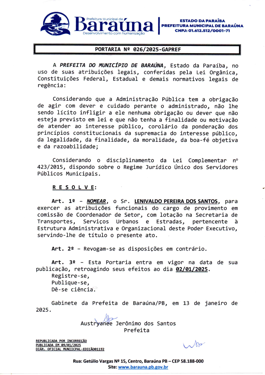 PORTARIA N° 026/2025-GAPREF - NOMEAR O SRº LENIVALDO PEREIRA DOS SANTOS, PARA EXERCER AS ATRIBUIÇÕES FUNCIONAIS DO CARGO DE PROVIMENTO EM COMISSÃO DE COORDENADOR DE SETOR. - 16 DE JANEIRO DE 2025.