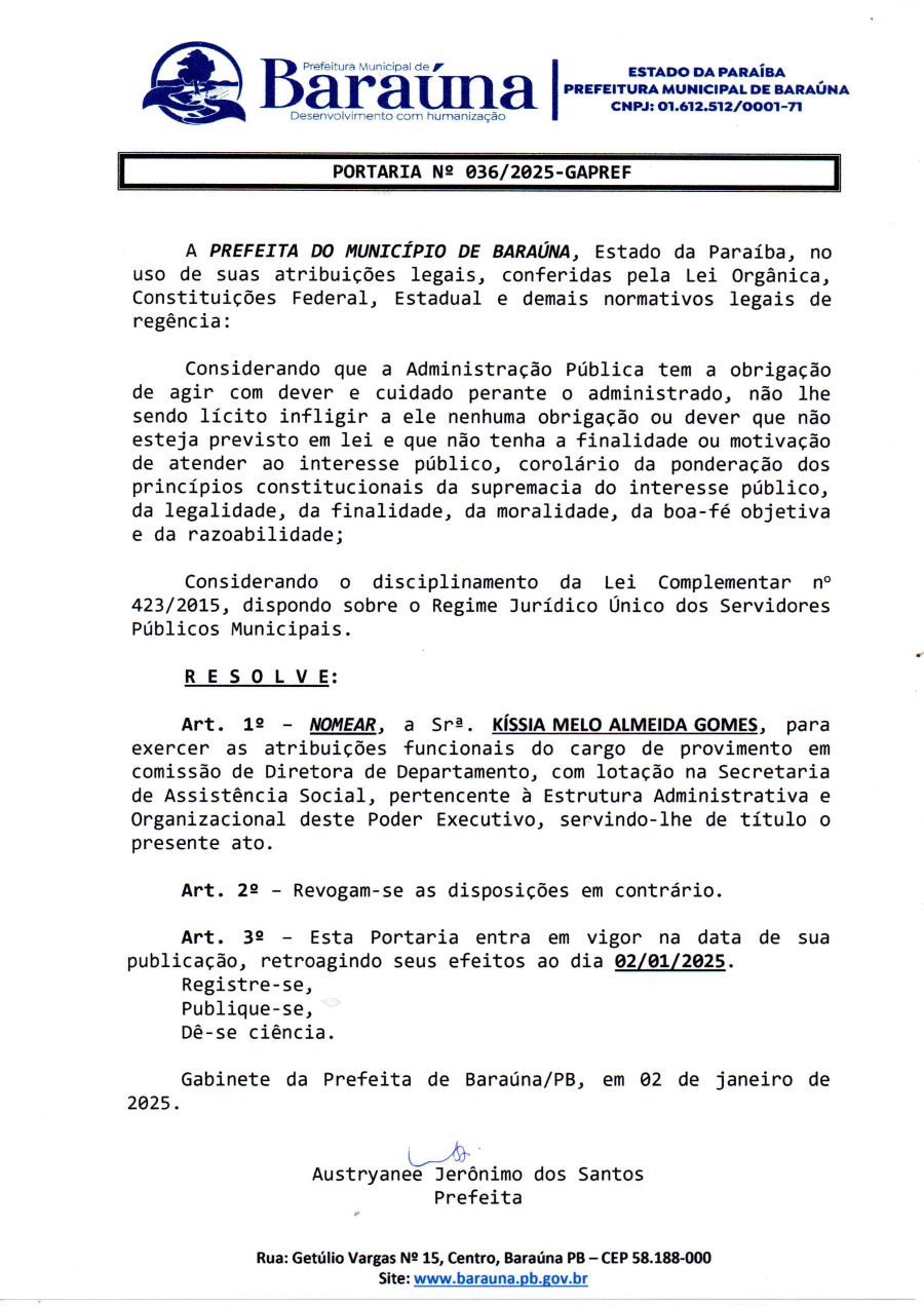 PORTARIA Nº 036/2025-GAPREF - NOMEAR A SRª KISSIA MELO ALMEIDA GOMES, PARA EXERCER AS ATRIBUIÇÕES FUNCIONAIS DO CARGO DE PROVIMENTO EM COMISSÃO DE DIRETORA DE DEPARTAMENTO. - 16 DE JANEIRO DE 2025.