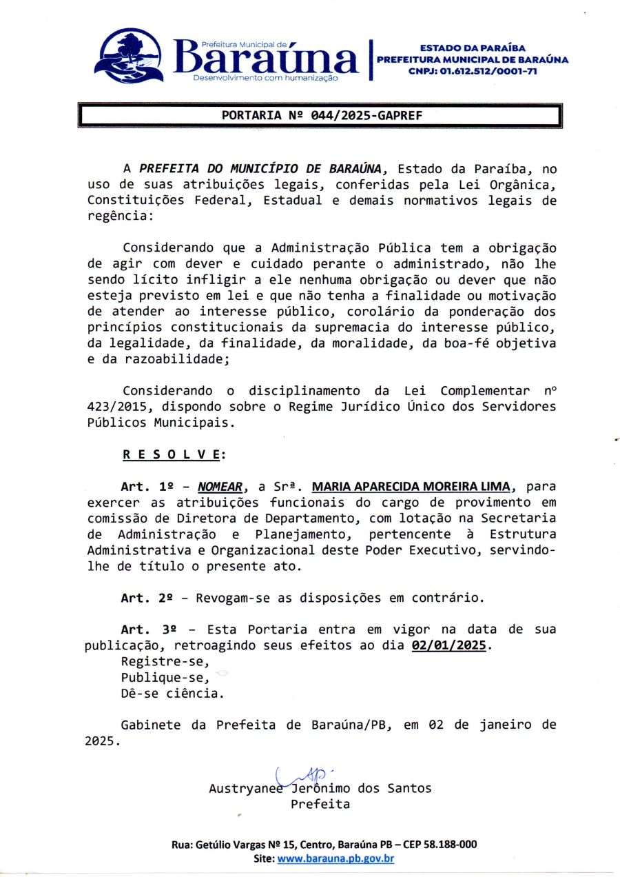 PORTARIA Nº 044/2025-GAPREF - NOMEAR A SRª MARIA APARECIDA MOREIRA LIMA, PARA EXERCER AS ATRIBUIÇÕES FUNCIONAIS DO CARGO DE PROVIMENTO EM COMISSÃO DE DIRETORA DE DEPARTAMENTO, - 16 DE JANEIRO DE 2025.