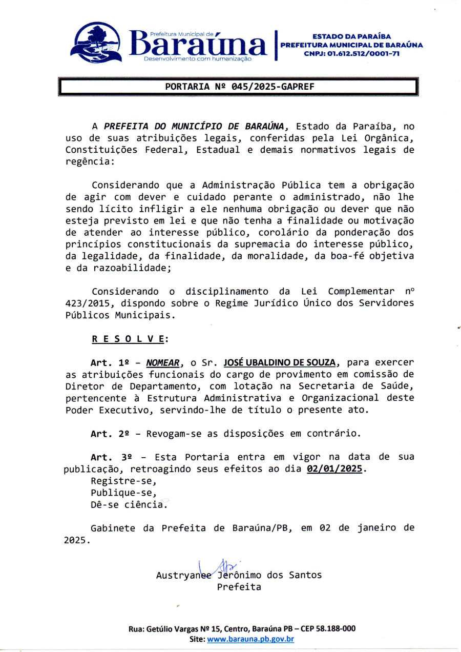 PORTARIA Nº 045/2025-GAPREF - NOMEAR O SR. JOSE UBALDINO DE SOUZA, PARA EXERCER AS ATRIBUIÇÕES FUNCIONAIS DO CARGO DE PROVIMENTO EM COMISSÃO DE DIRETOR DE DEPARTAMENTO. - 16 DE JANEIRO DE 2025.