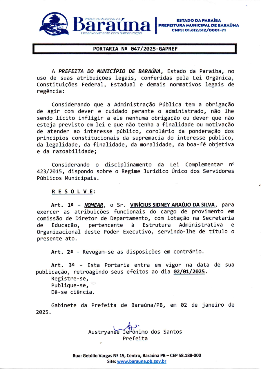 PORTARIA Nº 047/2025-GAPREF - NOMEAR O SRº VINICIUS SIDNEY ARAÚJO DA SILVA, PARA EXERCER AS ATRIBUIÇÕES DO CARGO DE PROVIMENTO EM COMISSÃO DE DIRETOR DE DEPARTAMENTO. - 16 DE JANEIRO DE 2025.