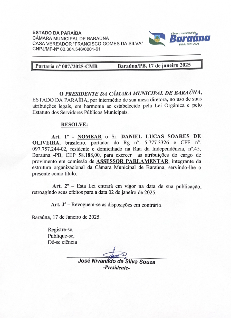 PORTARIA Nº 007/2025-CMB - NOMEAR O SRº DANIEL LUCAS SOARES DE OLIVEIRA, PARA EXERCER AS ATRIBUIÇÕES DO CARGO EM PROVIMENTO EM COMISSÃO DE ASSESSOR PARLAMENTAR. - 17 DE JANEIRO DE 2025.