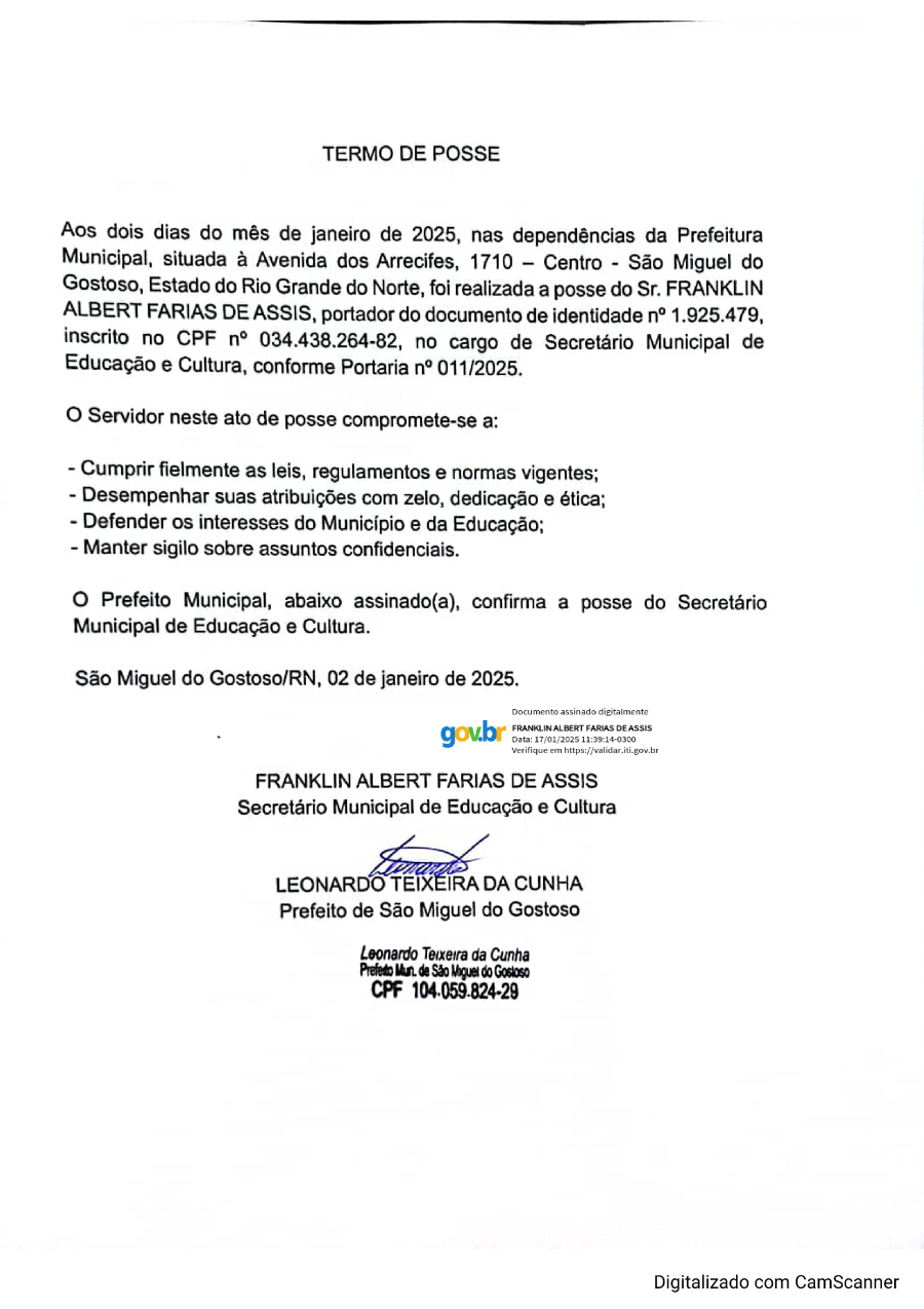 TERMO DE POSSE DO SECRETARIO MUN DE EDUCAÇÃO E CULTURA DE SMG/RN