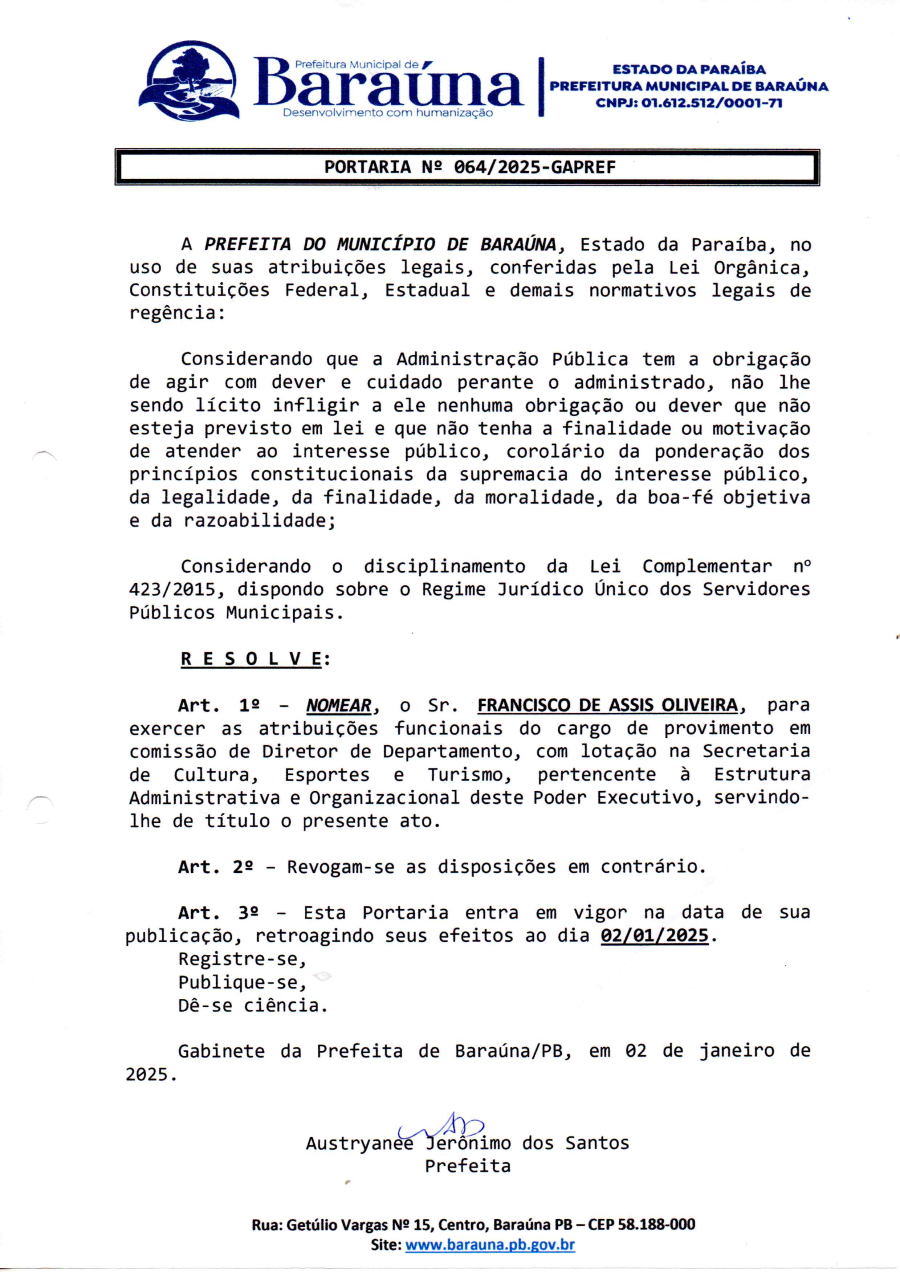 PORTARIA Nº 064/2025-GAPREF - NOMEAR O SRº FRANCISCO DE ASSIS OLIVEIRA, PARA EXERCER AS ATRIBUIÇÕES FUNCIONAIS DO CARGO DE PROVIMENTO EM COMISSÃO DE DIRETOR DE DEPARTAMENTO. - 22 DE JANEIRO DE 2025.