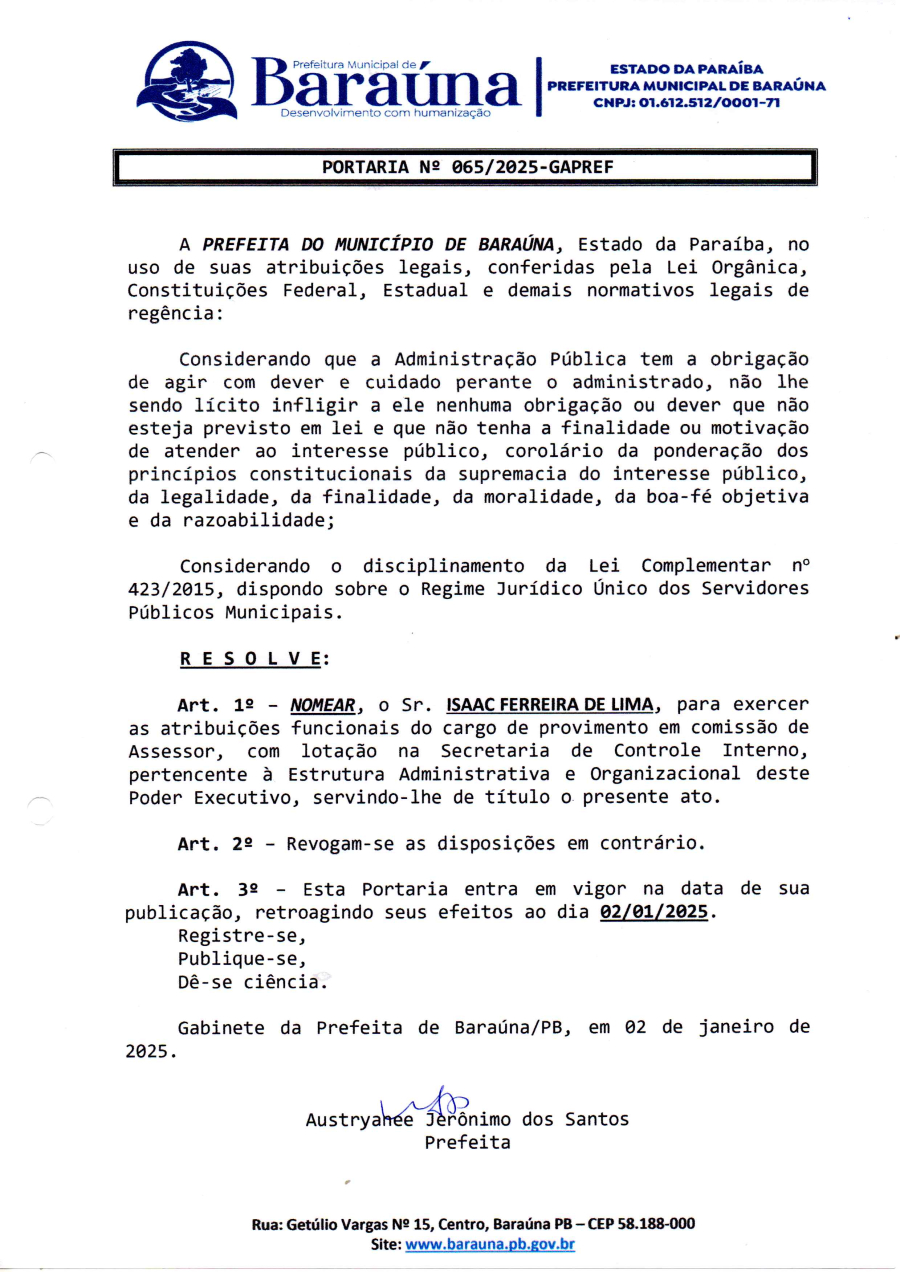PORTARIA Nº 065/2025-GAPREF - NOMEAR ISAAC FERREIRA DE LIMA, PARA EXERCER AS ATRIBUIÇÕES FUNCIONAIS DO CARGO DE PROVIMENTO EM COMISSÃO DE ASSESSOR. - 22 DE JANEIRO DE 2025.