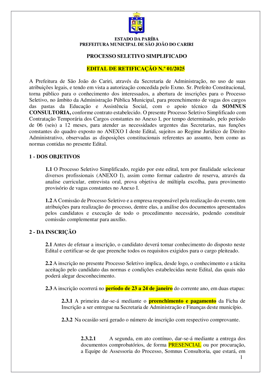 EDITAL DE RETIFICAÇÃO 01/2025 - PROCESSO SELETIVO SIMPLIFICADO