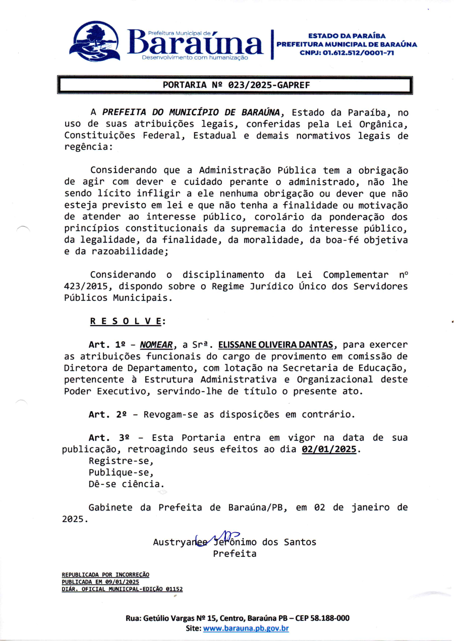 PORTARIA Nº 023/2025-GAPREF - NOMEAR A SRª ELISSANE OLIVEIRA DANTAS, PARA EXERCER AS ATRIBUIÇÕES FUNCIONAIS DO CARGO DE PROVIMENTO EM COMISSÃO DE DIRETORA DE DEPARTAMENTO . - 22 DE JANEIRO DE 2025.