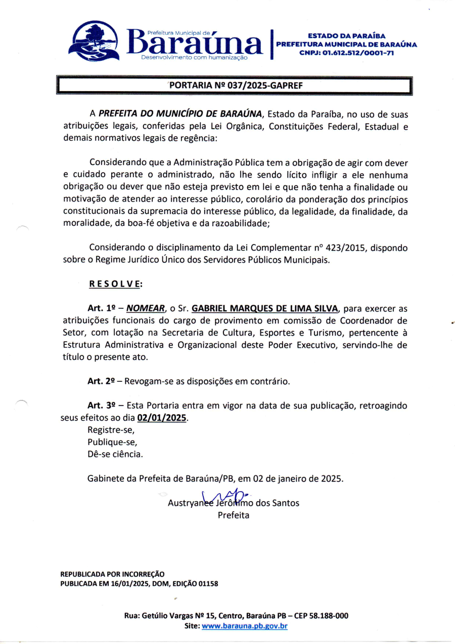 PORTARIA Nº 037/2025-GAPREF - NOMEAR O SRº GABRIEL MARQUES DE LIMA SILVA, PARA EXERCER AS ATRIBUIÇÕES FUNCIONAIS DO CARGO DE PROVIMENTO EM COMISSÃO DE COORDENADOR DE SETOR. - 22 DE JANEIRO DE 2025.