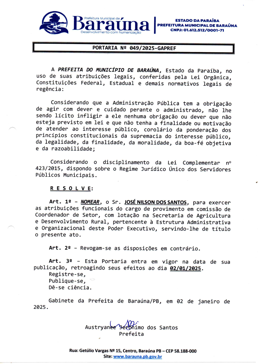 PORTARIA Nº 049/2025-GAPREF - NOMEAR O SRº JOSE NILSON DOS SANTOS, PARA EXERCER AS ATRIBUIÇÕES FUNCIONAIS DO CARGO DE PROVIMENTO EM COMISSÃO DE COORDENADOR DE SETOR. - 22 DE JANEIRO DE 2025.