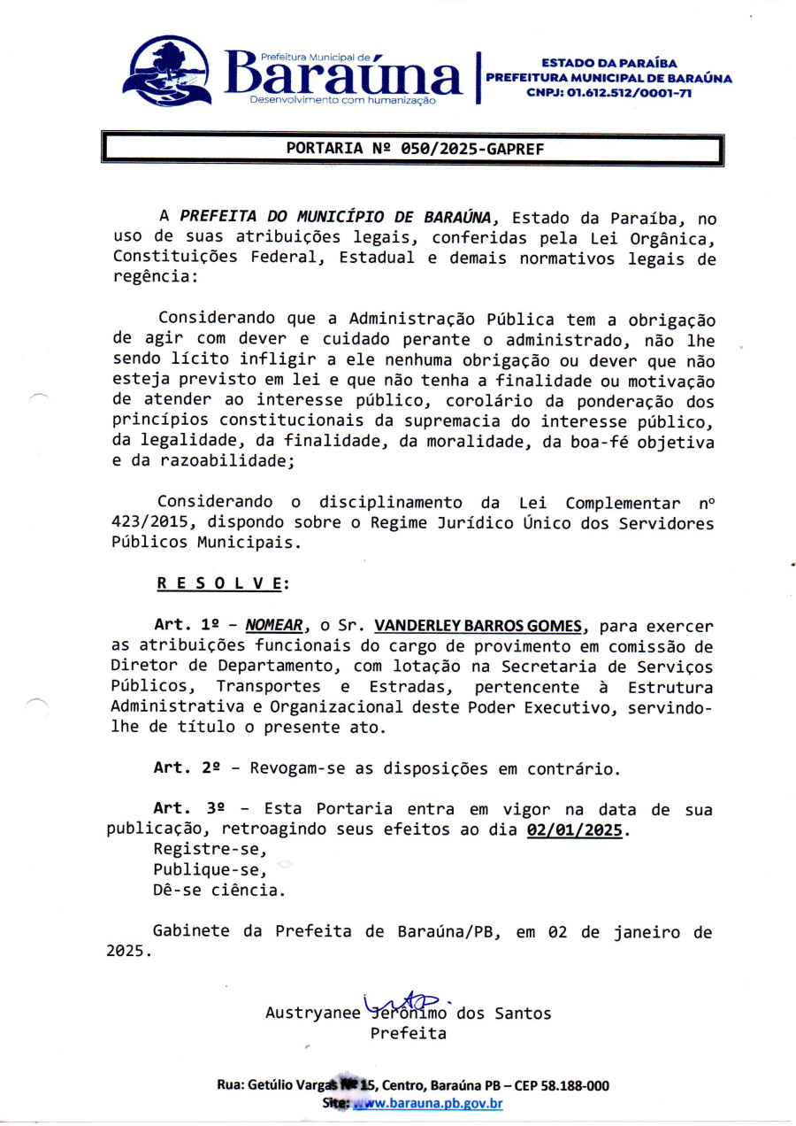 PORTARIA Nº 050/2025-GAPREF - NOMEAR O SRº VANDERLEY BARROS GOMES, PARA EXERCER AS ATRIBUIÇÕES DO CARGO DE PROVIMENTO EM COMISSÃO DE DIRETOR DE DEPARTAMENTO. - 22 DE JANEIRO DE 2025.