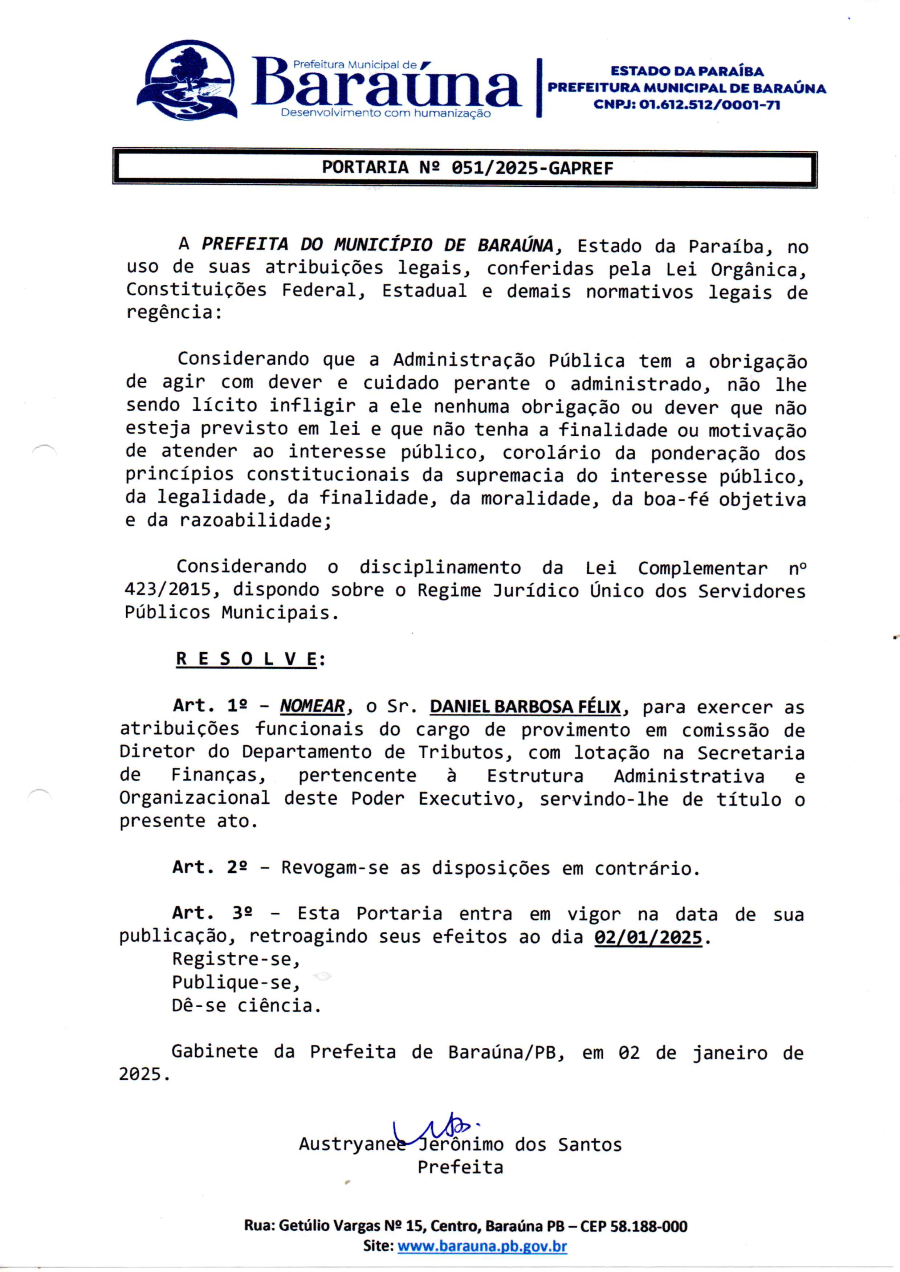 PORTARIA Nº 051/2025-GAPREF - NOMEARA O SRº DANIEL BARBOSA FELIX, PARA EXERCER AS ATRIBUIÇÕES FUNCIONAIS DO CARGO DE PROVIMENTO EM COMISSÃO DE DIRETOR DE DEPARTAMENTO DE TRIBUTOA. - 22 DE JANEIRO DE 2025.