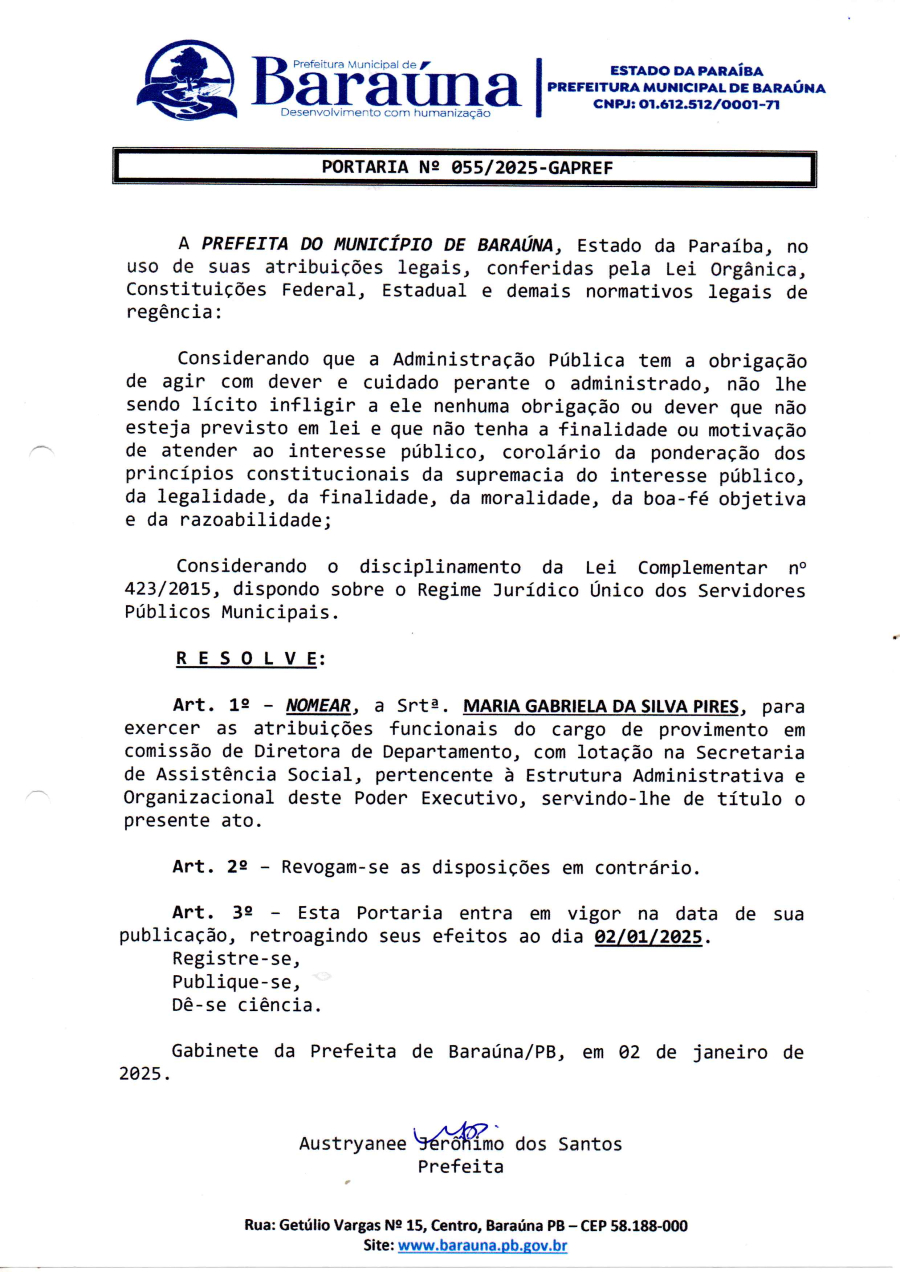 PORTARIA Nº 055/2025-GAPREF - NOMEAR A SRTª MARIA GABRIELA DA SILVA PIRES, PARA EXERCER AS ATRIBUIÇÕES FUNCIONAIS DO CARGO DE PROVIMENTO EM COMISSÃO DE DIRETORA DE DEPARTAMENTO. - 22 DE JANEIRO DE 2025.