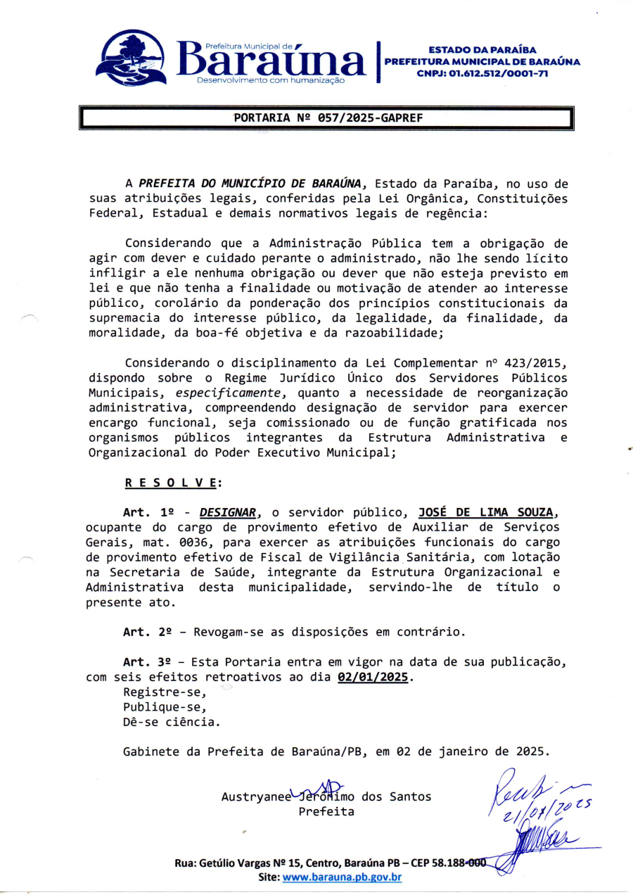 PORTARIA Nº 057/2025-GAPREF - DESIGNAR O SERVIDOR PÚBLICO JOSE DE LIMA SOUSA, OCUPANTE DO CARGO DE PROVIMENTO EFETIVO DE AUXILIAR DE SERVIÇOS GERAIS, PARA EXERCER AS ATRIBUIÇÕES FUNCIONAIS DO CARGO DE PROVIMENTO EFETIVO DE FISCAL DE VIGILÂNCIA SANITÁRIA. - 22 DE JANEIRO DE 2025.