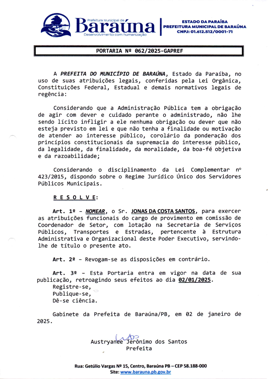 PORTARIA Nº 062/2025-GAPREF - NOMEAR O SRº JONAS DA COSTA SANTOS, PARA EXERCER AS ATRIBUIÇÕES FUNCIONAIS DO CARGO DE PROVIMENTO EM COMISSÃO DE COORDENADOR DE SETOR. - 22 DE JANEIRO DE 2025.