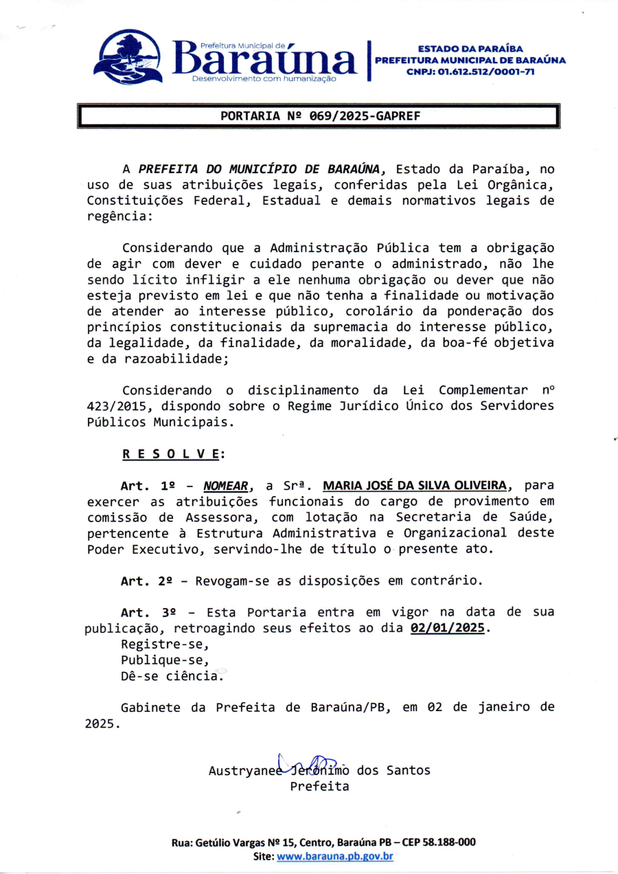 PORTARIA Nº 069/2025-GAPREF - NOMEAR A SRª MARIA JOSÉ DA SILVA OLIVEIRA, PARA EXERCER AS ATRIBUIÇÕES FUNCIONAIS DO CARGO DE PROVIMENTO EM COMISSÃO DE ASSESSORA. - 23 DE JANEIRO DE 2025.
