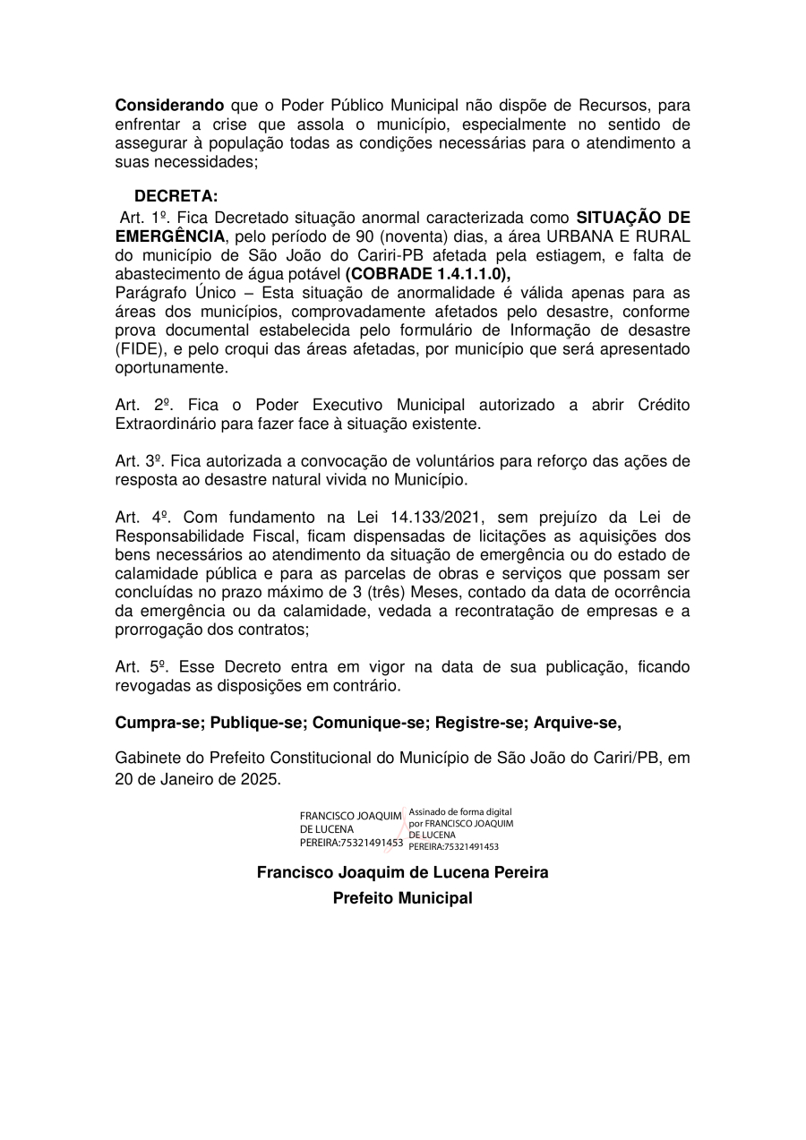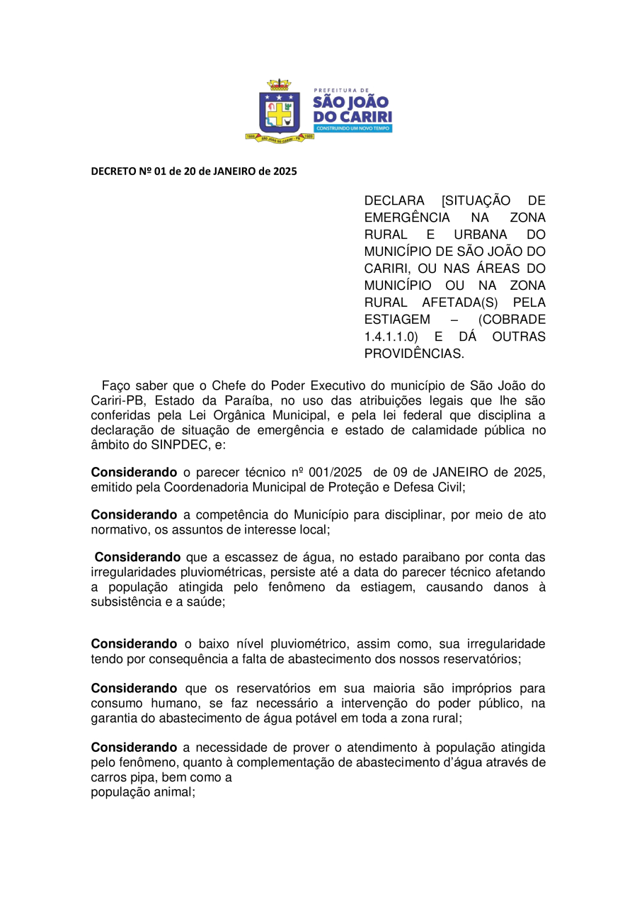 DECRETO 01/2025 - DECLARA [SITUAÇÃO DE EMERGÊNCIA NA ZONA RURAL E URBANA DO MUNICÍPIO DE SÃO JOÃO DO CARIRI, OU NAS ÁREAS DO MUNICÍPIO OU NA ZONA RURAL AFETADA(S) PELA ESTIAGEM – (COBRADE 1.4.1.1.0) E DÁ OUTRAS PROVIDÊNCIAS.