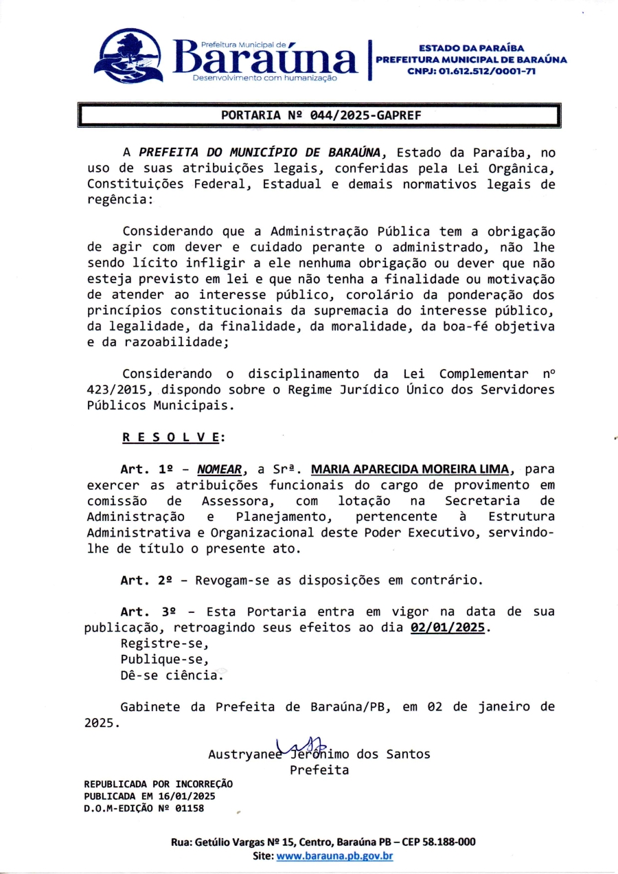 PORTARIA Nº 044/2025-GAPREF - REPUBLICADA - NOMEAR A SRª MARIA APARECIDA MOREIRA LIMA, PARA EXERCER AS ATRIBUIÇÕES FUNCIONAIS DO CARGO DE PROVIMENTO EM COMISSÃO DE ASSESSORA. - 23 DE JANEIRO DE 2025.