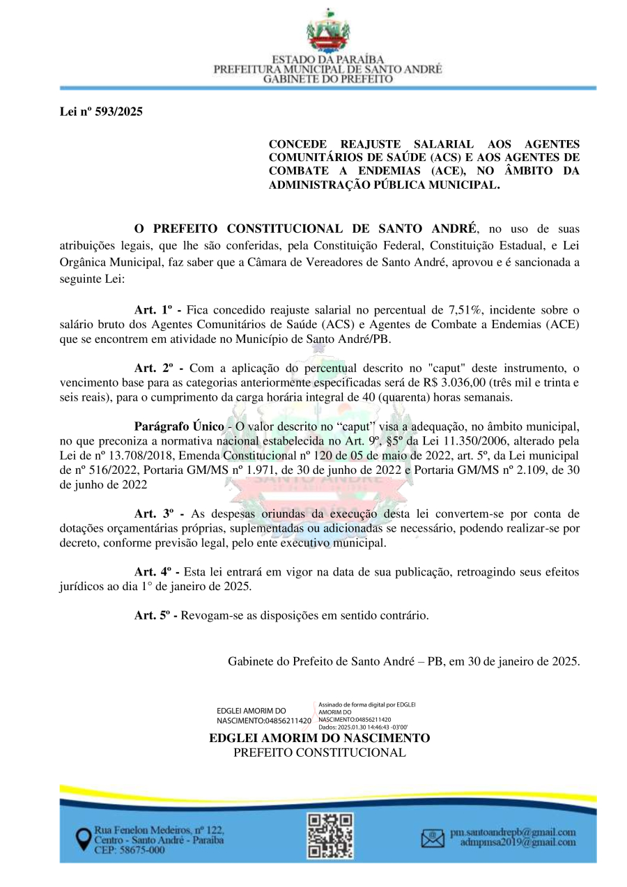 LEI Nº 593/2025 - CONCEDE REAJUSTE SALARIAL AOS AGENTES COMUNITÁRIOS DE SAÚDE (ACS) E AOS AGENTES DE COMBATE A ENDEMIAS (ACE), NO ÂMBITO DA ADMINISTRAÇÃO PÚBLICA MUNICIPAL.
