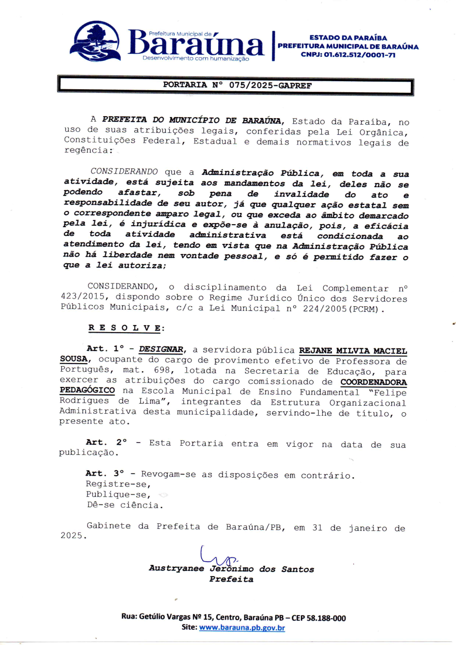 PORTARIA Nº 075/2025-GAPREF - DESIGNAR A SERVIDORA PÚBLICA REJANE MILVIA MACIEL SOUSA, OCUPANTE DO CARGO DE PROVIMENTO EFETIVO DE PROFESSORA DE PORTUGUÊS, PARA EXERCER AS ATRIBUIÇÕES DO CARGO COMISSIONADO DE COORDENADORA PEDAGOGICO. - 03 DE FEVEREIRO DE 2025.