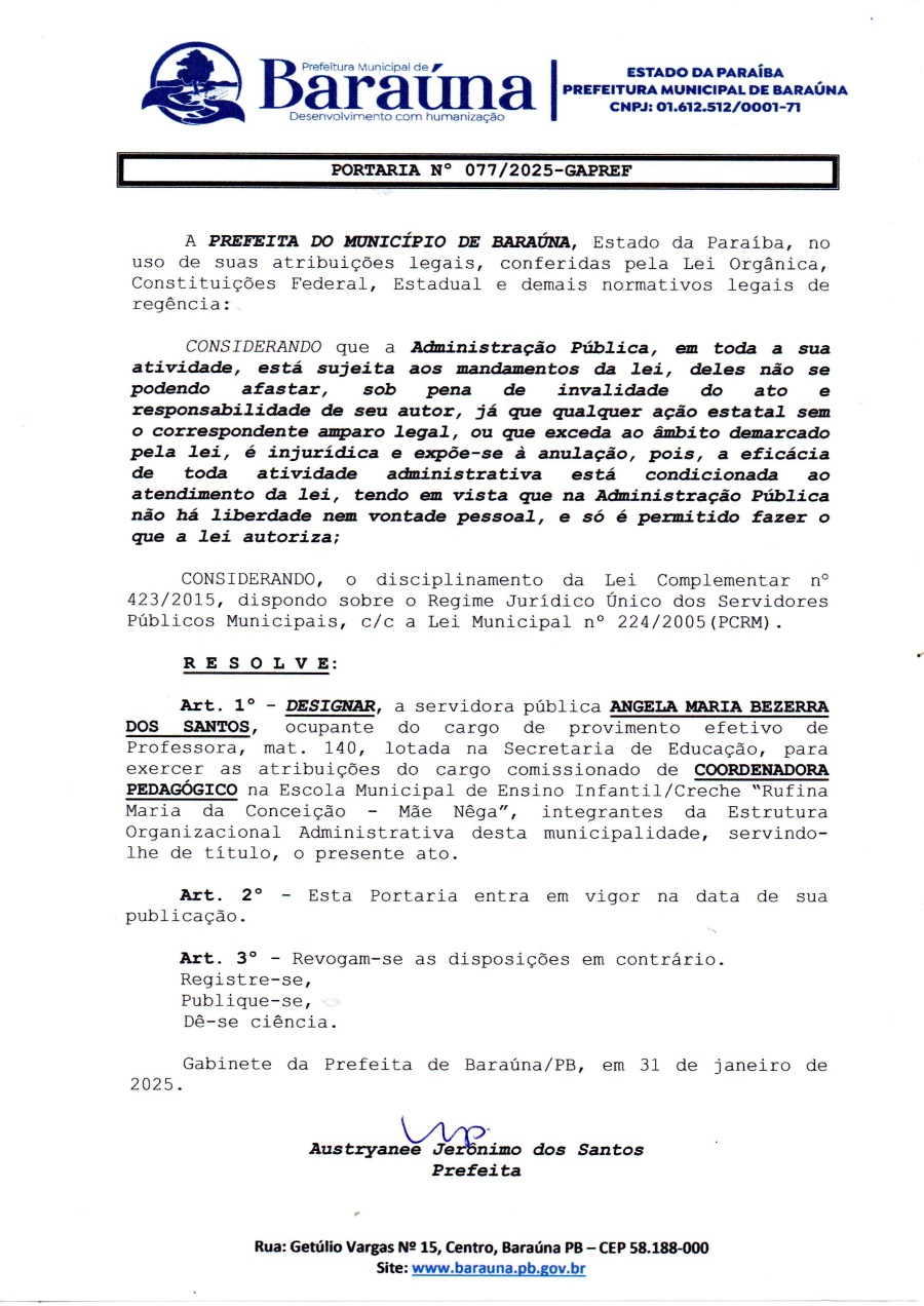 PORTARIA Nº 077/2025GAPREF - DESIGNAR A SERVIDORA PÚBLICA ANGELA MARIA BEZERRA DOS SANTOS, OCUPANTE DO CARGO DE PROVIMENTO EFETIVO DE PROFESSORA, PARA EXERCER AS ATRIBUIÇÕES DO CARGO COMISSIONADO DE COOERDENADORA PEDAGÓGICO. - 03 DE FEVEREIRO DE 2025.