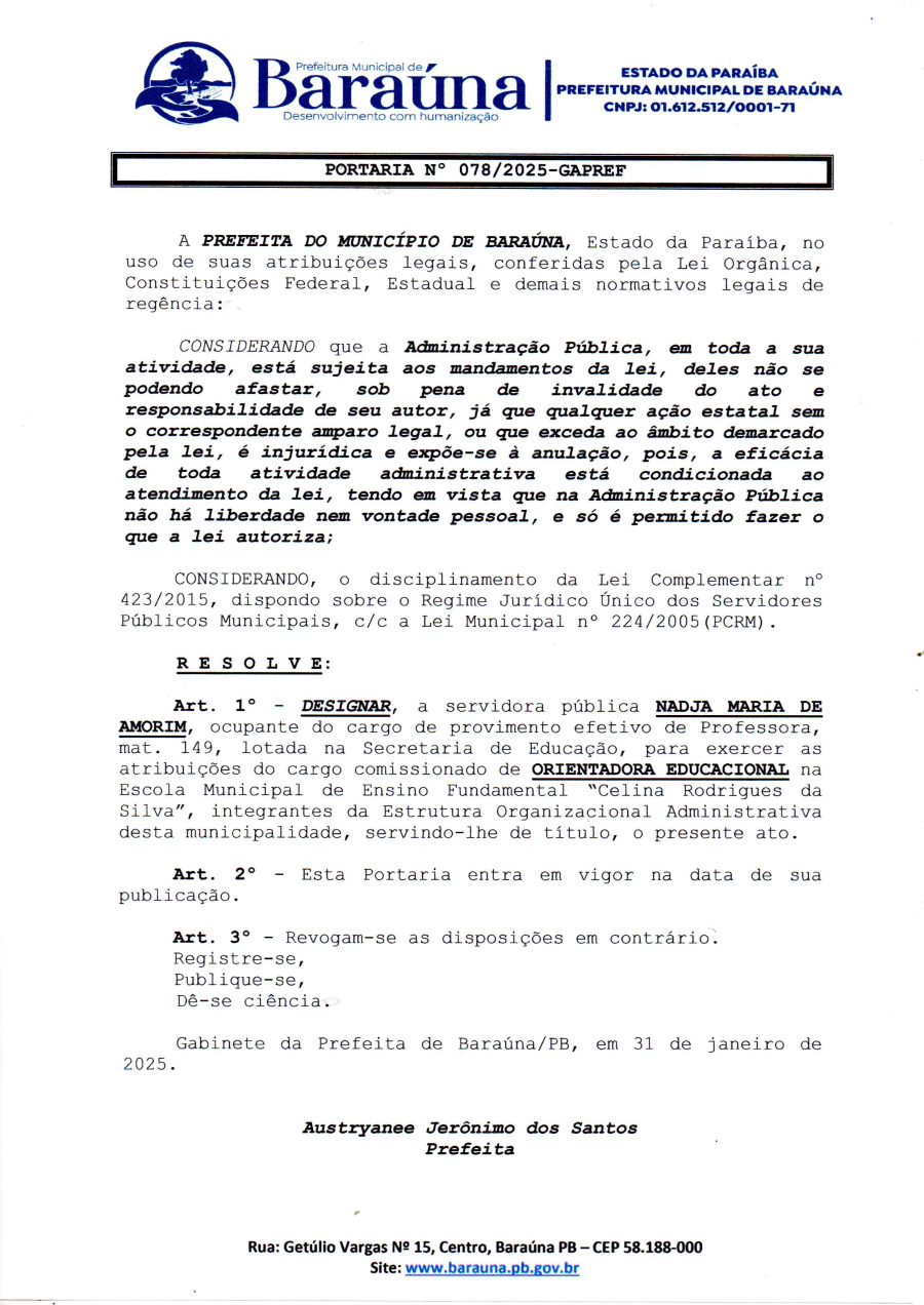 PORTARIA Nº 078/2025-GAPREF - DESIGNAR A SERVIDORA PÚBLICA NADJA MARIA DE AMORIM, OCUPANTE DO CARGO EFETIVO DE PROFESSORA, PARA EXERCER AS ATRIBUIÇÕES DO CARGO COMISSIONADO DE ORIENTADORA EDUCACIONAL. - 03 DE FEVEREIRO DE 2025.