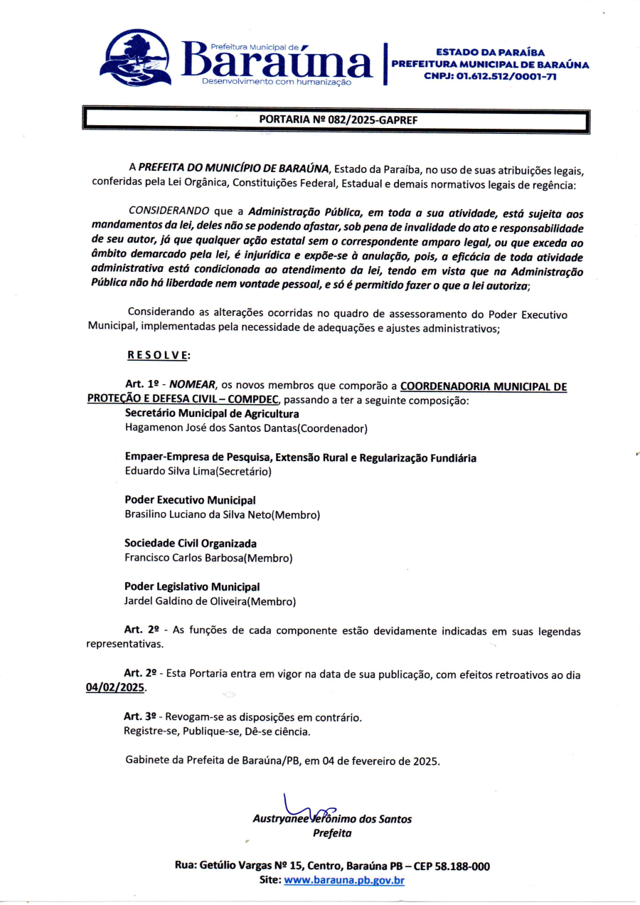 PORTARIA Nº 082/2025-GAPREF - NOMEAR OS NOVOS MEMBROS QUE COMPORÃO A COORDENADORIA MUNICIPAL DE PROTEÇÃO E DEFESA CIVIL - COMPDEC. - 04 DE FEVEREIRO DE 2025.
