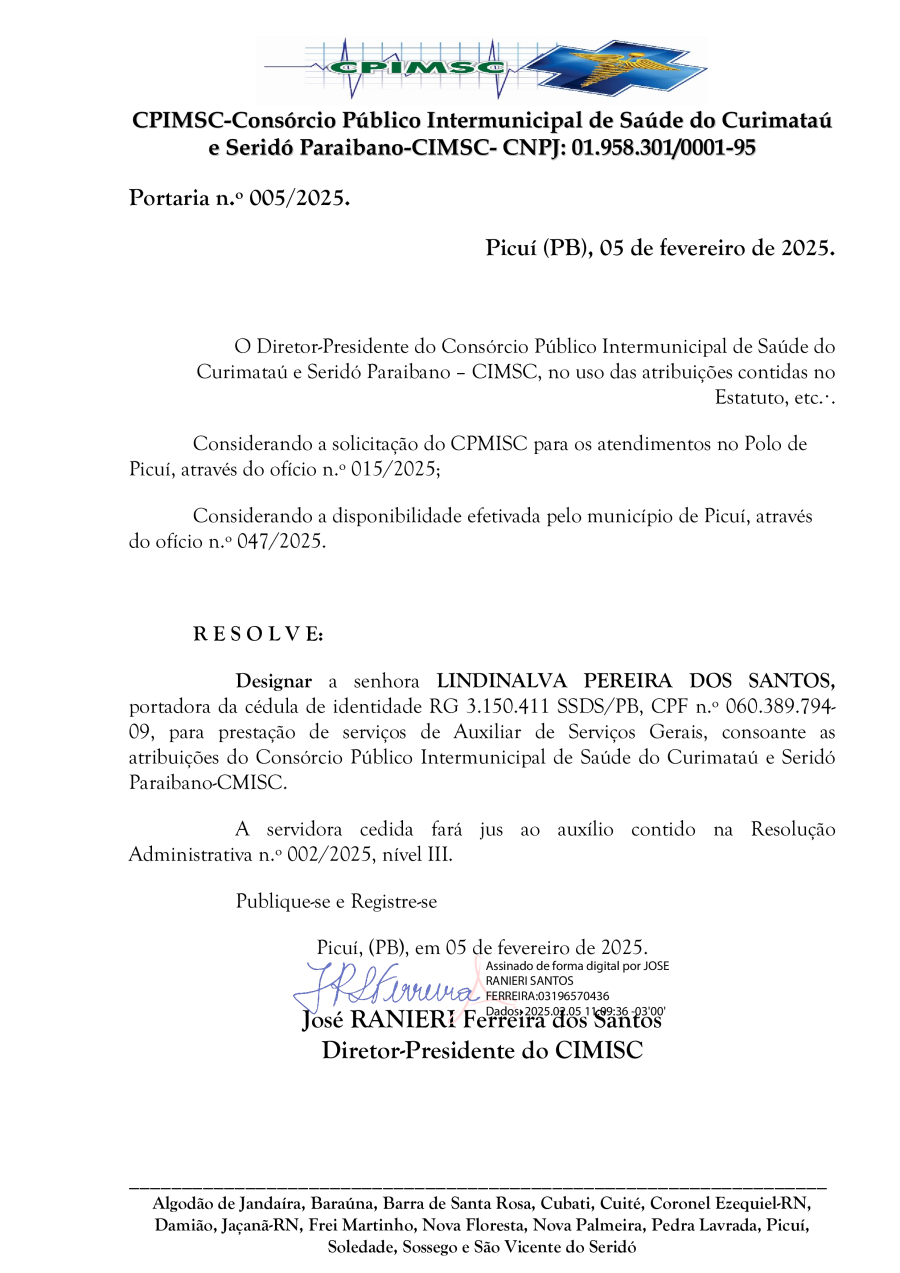 PORTARIA N° 0005/2025 - DESIGNAR A SENHORA LINDINALVA PEREIRA DOS SANTOS