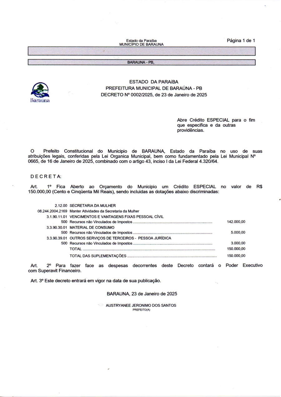 DECRETO Nº 002/2025 ABRE CREDITO ESPECIAL PARA O FIM QUE ESPECIFICA E DA OUTRAS PROVIDÊNCIAS. - 07 DE FEVEREIRO DE 2025.