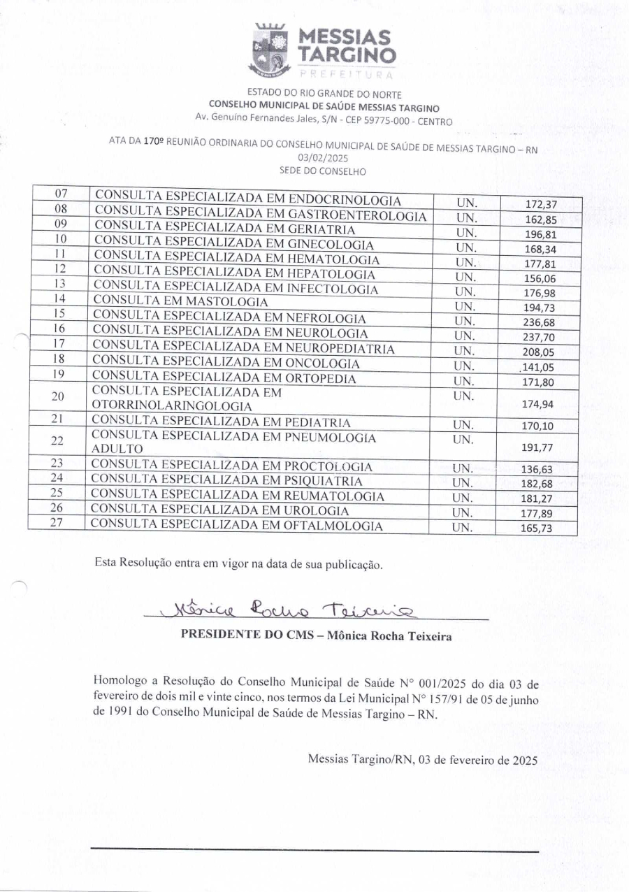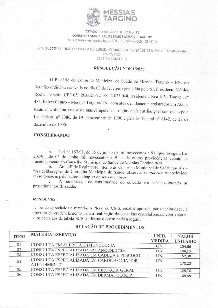 RESOLUÇÃO Nº 170 - CONSELHO MUNICIPAL DE SAÚDE MESSIAS TARGINO