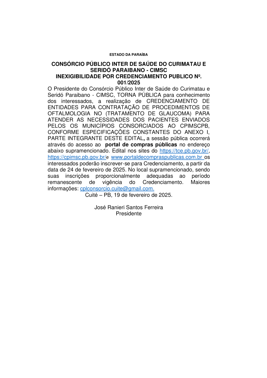 Conforme MP n° 2.200-2 de 24/08/2001, que institui a infraestrutura de chaves Públicas. Matéria Publicada no Diário Oficial do Consórcio Intermunicipal de Saúde do Curimataú e Seridó Paraibano/PB no dia - Edição 01167.